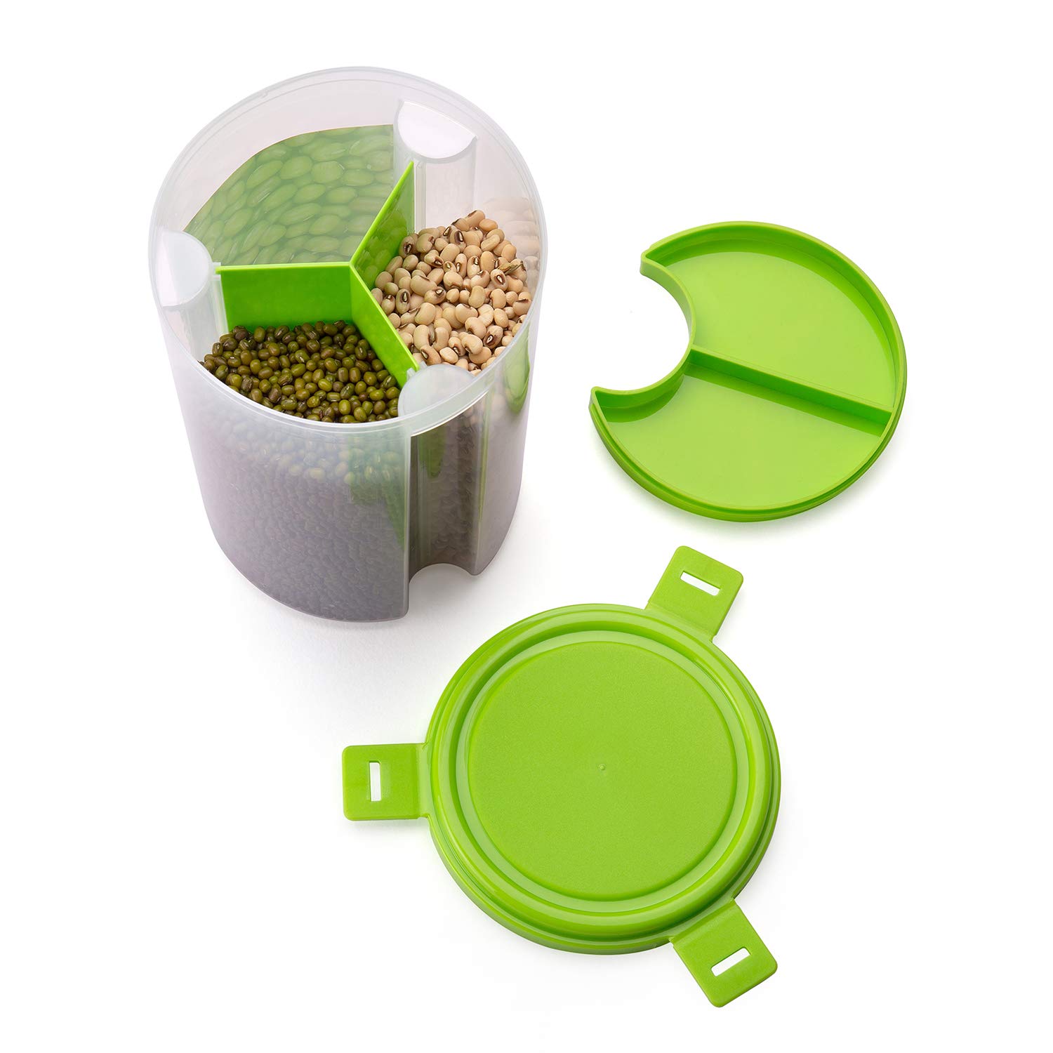 - The lid has an airtight seal that keeps the foods fresh for a long. 3 clip locks for secure closure. The package contains 1 piece food storage jar with 3 sections. you can keep 3 types of foods, grains, pulses, cereals, flour, snacks, dry fruits, rice, pasta, biscuits in the same jar without mixing. 3 secure clip locks close the lid safely on the jar